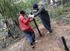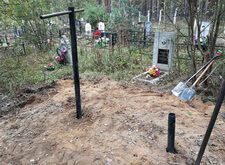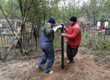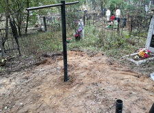 На данном участке изначально присутствовал только простой бетонный памятник и металлическое ограждение. Нам же необходимо было привести территорию могилы в полный порядок. Приступая к работе, мы первым делом вкручиваем определяющие фундамент сваи.