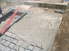 Засыпаем брусчатку пескобетоном, снимаем лишний слой, замываем.