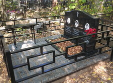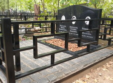 Изготавливаем вазу, наносим изображение. Перед памятником делаем небольшую площадку под траурную урну. Лавочка, установленная на участке, изготовлена полностью из металла. Торцы прямоугольных труб закрыты заглушками, которые надёжно защищают полости от проникновения влаги в период с осени до весны.