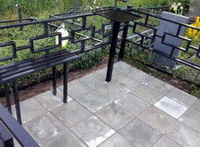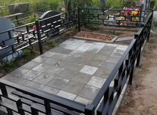 Затем переходим к последовательной укладке наземного покрытия. Предварительно застелив всю площадь участка геотекстилем, мы рассыпали пескобетонную смесь, на которую и выкладываем плитку. Работа с покрытием проходит поэтапно: мы начинаем от дальнего к надгробью края могилы, установив там дополнительные лавочку и столик.