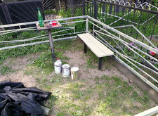 Затем мы красим оградку, выставляем по уровню памятник, дополнительно окрашиваем находящиеся на участке лавочку и столик. Вот как выглядело место захоронения на момент сдачи объекта.