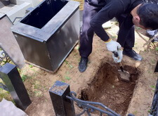 Первым делом мы взялись за установку саркофага: изготовив предварительно саркофаг, размещаем его на могиле под уровнем плитки. Предварительно территория места захоронения была полностью очищена от сорняка и прочего мусора.
