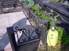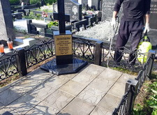 Дожидаемся высыхания бетонной плитки, затем проверяем её на прочность. Покрытие не поддаётся внешнему воздействию, а значит цемент успешно застыл и плитка надёжно зафиксирована на могиле. Фотографируем окончательное состояние места захоронения.