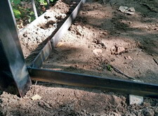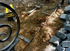 Монтируем оградку, вваривая согласованные с клиентом уголки. По низу пускаем металлическую ленту, которая обозначит границу выложенной брусчаткой территории.